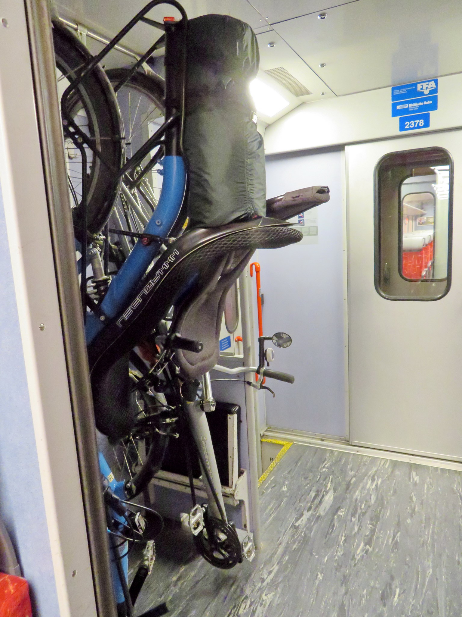 Early the next morning we were ready and waiting at the bus stop, our panniers taken off the bikes and neatly arranged by the side of the road. The bus arrived on time and yes, it had a bike trailer. And yes, the driver let us put our recumbents “if they fit” – and they did fit. What a luxury having this big trailer just for our bikes!