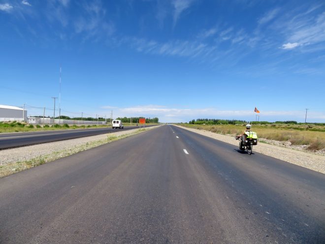 La route qui sort de Neuquén en direction de Bariloche est en travaux, il semble y avoir un grand projet d’élargissement de la route mais qui ne semble pas avancer depuis plusieurs mois. Tant mieux pour nous, car il y a une voie parallèle à la route, parfaitement asphaltée, mais inutilisée. Nous avons donc une sorte de piste cyclable géante rien que pour nous, sauf pour passer les ponts et les villages, où cette nouvelle voie est interrompue.