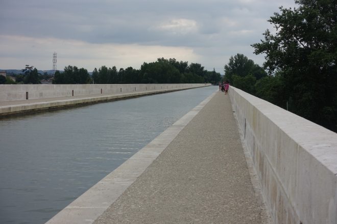 Nous repartons après une journée reposante à Agen chez nos hôtes warmshowers, avec un gros sac de pruneaux dans la sacoche. Nous ratons tout juste le passage d’un bateau sur l’impressionnant pont-canal.